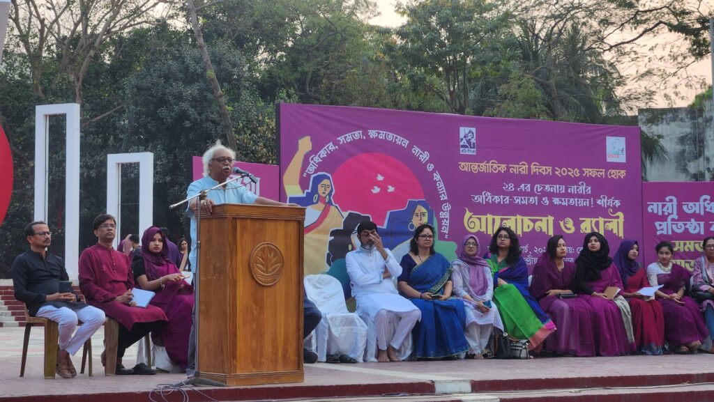 স্বাগত বক্তব্যে আলমগীর কবির বলেন, প্রতি বছর নানান প্রতিপাদ্য নিয়ে নারী দিবস উৎযাপন করা হয় কিন্তু পরিতাপের বিষয় নারীর প্রতি সব ধরনের সহিংসতা ও বৈষম্য বেড়েই যাচ্ছে। নারী ও শিশু এখন অনেক বেশি অনিরাপদ। তিন বছরের আছিয়াও আজ নিরাপদ নয় ধর্ষকদের হাত থেকে। নারীদের ন্যায্যতার বিষয়ে আর ছাড় দেওয়ার সুযোগ নেই।