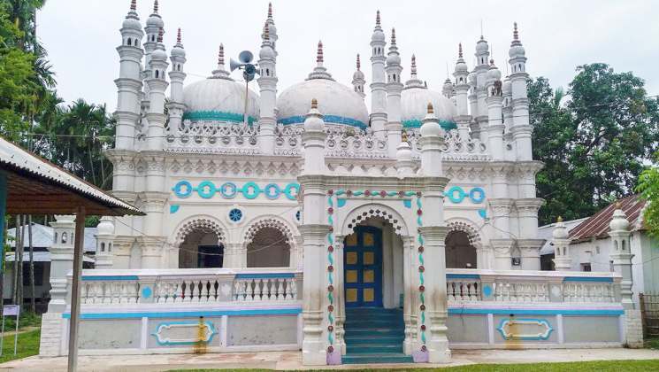 মসজিদ অঙ্গনে প্রবেশমুখে বেশ বড় সুন্দর একটি তোরণ রয়েছে। মসজিদে উপরে বড় আকৃতির তিনটি গম্বুজ আছে। গম্বুজের শীর্ষদেশ কাচ পাথরের কারুকাজ করা আছে। এই মসজিদের প্রধান বৈশিষ্ট্য হলো এর মিনারগুলো নকশা। মসজিদের ছাদে মোট আটাশটি মিনার আছে। একেকটি মিনার উচ্চতা প্রায় ৩৫ ফুট এবং প্রতিটিতে নানা নকশা করা রয়েছে। এত মিনারয়ালা কোন মসজিদে দেখতে পাওয়া বিরল ব্যপার। মসজিদটির চারটি অংশে ভাগ করা। তাহলো মূল কক্ষ, মূল কক্ষের সঙ্গে ছাদসহ বারান্দা, ছাদবিহীন বারান্দা এবং ছাদবিহীন বারান্দাটি অর্ধ প্রাচীরে বেষ্টিত হয়ে পূর্বাংশে মাঝখানে চার থামের উপর ছাদ বিশিষ্ট মূল দরজা। খোলা বারান্দার প্রাচীরে এবং মূল দরজার ছাদে ছোট ছোট মিনারের নানান নকশা রয়েছে। মূল কক্ষের বাইরের দিক থেকে পরিমাপ হচ্ছে ২৯ × ৪৭ ফুট এবং ছাদবিহীন বারান্দার পরিমাপ ২১ × ৪৭ ফুট। মূল কক্ষের কোণগুলো তিন থাম বিশিষ্ট। এর জানালা দুটি, দরজা তিনটি, কুলুঙ্গি দুটি। পুরো মসজিদটির ভিতরে ও বাইরের দেয়ালগুলোতে প্রচুর লতাপাতা ও ফুলের নকশা দ্বারা খচিত। প্রতি নিয়ত এই জমিদার বাড়িটির ইতিহাস জানতে দুরদুরান্ত থেকে আসা অনেক দর্শনার্থী ভিড় জমায়।