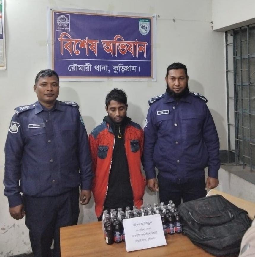 কুড়িগ্রাম জেলার রৌমারী থানা পুলিশের একটি চৌকস টিম অদ্য ২৪ জানুয়ারি ২০২৫ তারিখ সন্ধ্যা আনুমানিক ০৬:১৫ ঘটিকায় রৌমারী থানাধীন বন্দবেড় ইউনিয়নের ফলুয়ারচর নৌকাঘাট থেকে জামালপুর জেলার মাদারগঞ্জ থানাধীন চর গাপের গ্রাম এলাকার মাদক কারবারি মোঃ শহিদুল ইসলাম (৩৫) কে ৪০ বোতল ফেন্সিডিল সহ হাতেনাতে গ্রেফতার করে।