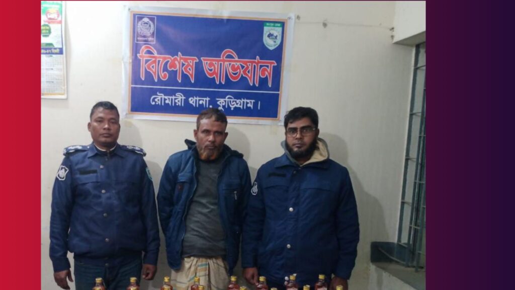 কুড়িগ্রাম জেলার রৌমারী থানা পুলিশের একটি চৌকস টিম অদ্য ০৯ জানুয়ারি ২০২৫ তারিখ ভোর আনুমানিক ০৫:০৫ ঘটিকায় রৌমারী থানাধীন বড়াইবাড়ী এলাকায় মাদক কারবারি মোঃ লাল মিয়া (৫০) এর নিজ বসতবাড়ি থেকে ৪১ বোতল বিদেশি মদসহ হাতেনাতে গ্রেফতার করে।