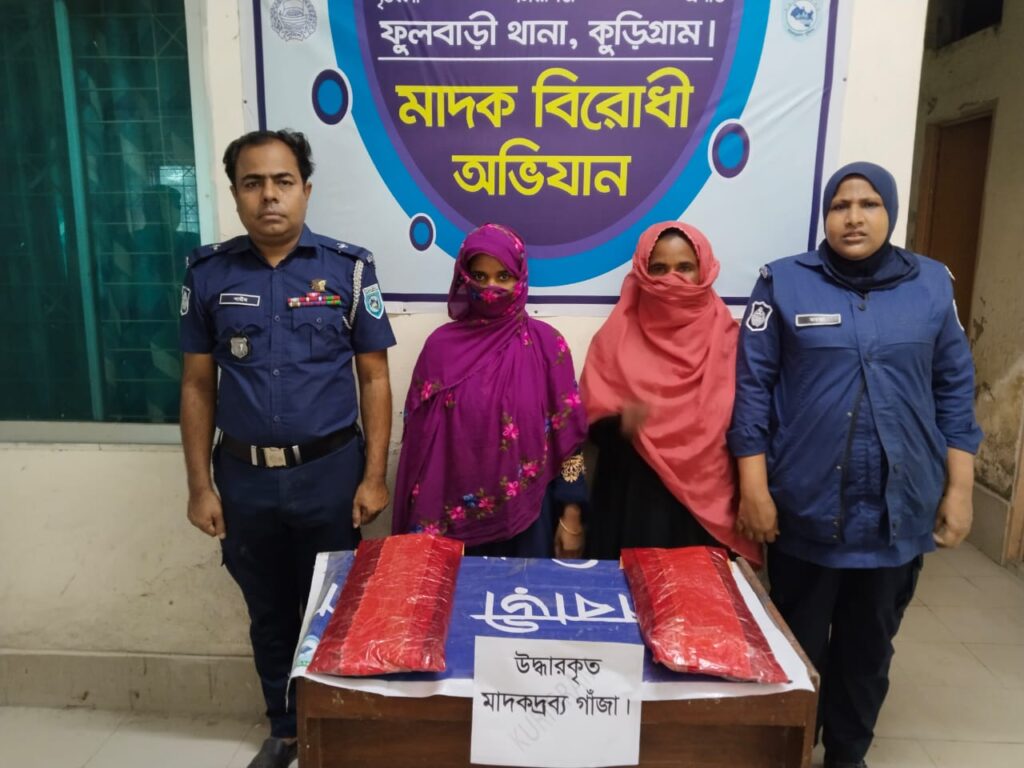 কুড়িগ্রাম জেলা ফুলবাড়ী পুলিশের একটি চৌকস টিম অদ্য ১১ জুলাই ২০২৪ বিকেল আনুমানিক ১৬:০০ ঘটিকায় গোপন সংবাদের ভিত্তিতে ফুলবাড়ী থানাধীন ধরলা ব্রিজ থেকে ফুলবাড়ীর পূর্ব ফুলমতি গ্রামের ২ জন মাদক কারবারি মোছাঃ জোহরা বেগম (৪৫) ও মোছাঃ সাবেরা বেগম (২৫) দ্বয়কে যাত্রী বেশে বিশেষ কায়দায় শরীরে ফিটিংকৃত অবস্থায় ০২ কেজি গাঁজাসহ হাতেনাতে গ্রেফতার করে।