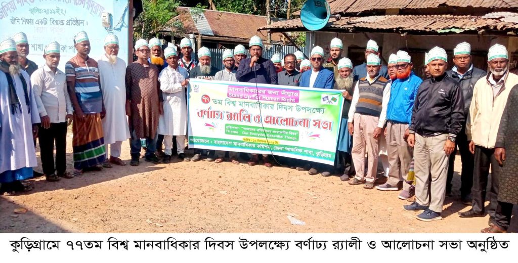 বাংলাদেশ মানবাধিকার কমিশন কুড়িগ্রাম জেলা আঞ্চলিক শাখার আয়োজনে আশরাফিয়া স্কুল সংলগ্ন নিজস্ব কার্যালয় হতে ১০ ডিসেম্বর বুধবার সকালে ৭৭তম বিশ্ব মানবাধিকার দিবস উপলক্ষ্যে একটি বর্ণাঢ্য র্যালী বের হয়। বাংলাদেশ মানবাধিকার কমিশন জেলা আঞ্চলিক শাখার সভাপতি মিনহাজুল ইসলাম মিলনের সভাপতিত্বে বিশ্ব মানবাধিকার দিবস উপলক্ষ্যে আলোচনা সভা অনুষ্ঠিত হয়। উক্ত আলোচনা সভায় সাধারণ সম্পাদক তাজুল ইসলাম খন্দকারের সঞ্চালনায় বক্তব্য রাখেন- জেলা আঞ্চলিক শাখার নির্বাহী সভাপতি মোঃ মাজেদ আলী, মহিলা বিষয়ক সম্পাদক মোছাঃ মরিয়ম বেগম, সংস্কৃতিক বিষয়ক সম্পাদক আশীষ নারায়ণ সরকার, আইন বিষয়ক সম্পাদক জাহেদুল ইসলাম, উমর মজিদ ইউনিয়ন শাখার সভাপতি আব্দুর রশিদ, দুর্গাপুর ইউনিয়ন শাখার সাধারণ সম্পাদক আব্দুর রাজ্জাক, প্রচার ও প্রকাশনা সম্পাদক নুরনবী সরকার, মানবাধিকার কর্মী মোক্তার আলী, নির্বাহী কমিটির সদস্য আব্দুস সবুর মিয়া প্রমূখ। এ সময় বাংলাদেশ মানবাধিকার কমিশন কুড়িগ্রাম জেলা আঞ্চলিক শাখার সভাপতি মিনহাজুল ইসলাম মিলন বলেন- মানবাধিকার রক্ষায় সকলকে সম্মিলিত ভাবে কাজ করতে হবে। কোন ভাবেই আইনের শাসন ও ন্যায় বিচার হতে কাউকেই বঞ্চিত হতে দেয়া হবে না। আগামী ১০ জানুয়ারী আমাদের জেলা আঞ্চলিক কার্যালয়ে প্রতিষ্ঠা বার্ষিকী উপলক্ষ্যে সাধারণ মানুষের জন্য ফ্রি মেডিকেল ক্যাম্পের আয়োজন করা হয়েছে। নারী ও পুরুষ চিকিৎসক উক্ত ফ্রি মেডিকেল ক্যাম্পে আগত রোগীদের বিনামূল্যে স্বাস্থ্য সেবা প্রদান করবেন।