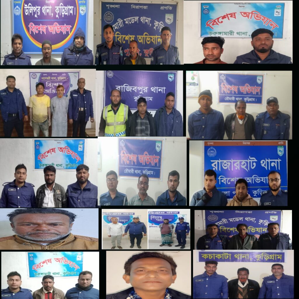 সারাদেশে অস্থিতিশীলতা সৃষ্টিকারী, পরিকল্পনাকারী ও সহযোগীদের গ্রেফতার পাশাপাশি অবৈধ অস্ত্র, গোলাবারুদ উদ্ধারের লক্ষে দেশব্যাপী চলমান অপারেশন ডেভিল হান্ট এর অংশ হিসেবে কুড়িগ্রাম জেলা পুলিশের সকল থানা এলাকায় আইনি কার্যক্রম ও বিশেষ অভিযান পরিচালনা চলমান রয়েছে।