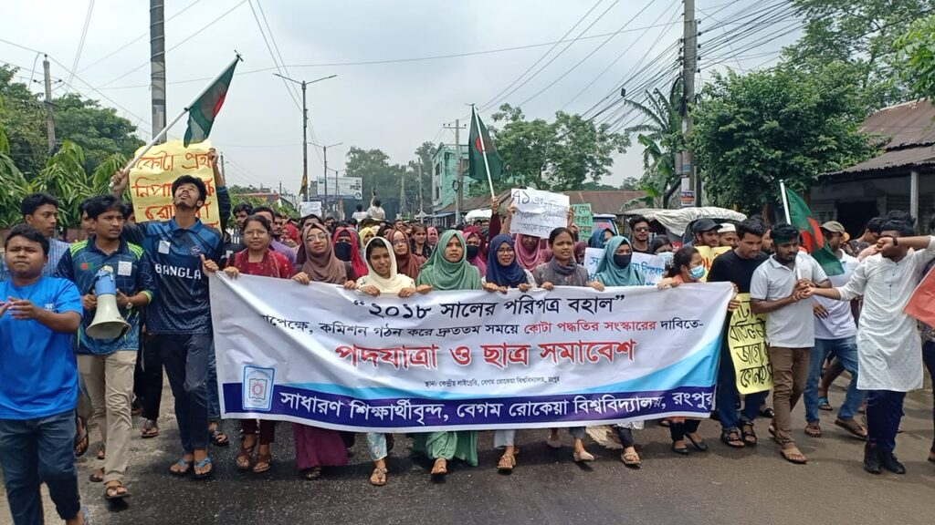 শনিবার (৬ জুলাই) সাধারণ শিক্ষার্থীদের ব্যানারে বিশ্ববিদ্যালয়ের বঙ্গবন্ধু চত্বরে বিক্ষোভ শুরু হয়। বিক্ষোভ মিছিলটি বিশ্ববিদ্যালয়ের প্রধান প্রধান সড়ক প্রদক্ষিণ শেষে বিশ্ববিদ্যালয় সংলগ্ন পার্কের মোড় হয়ে রংপুর নগরীরর প্রবশদ্বার মডার্ণ মোড়ে ঢাকা-রংপুর মহাসড়ক অবরোধ করেন। এসময় রাস্তার দুপাশে দীর্ঘ যানজটের সৃষ্টি হয়।