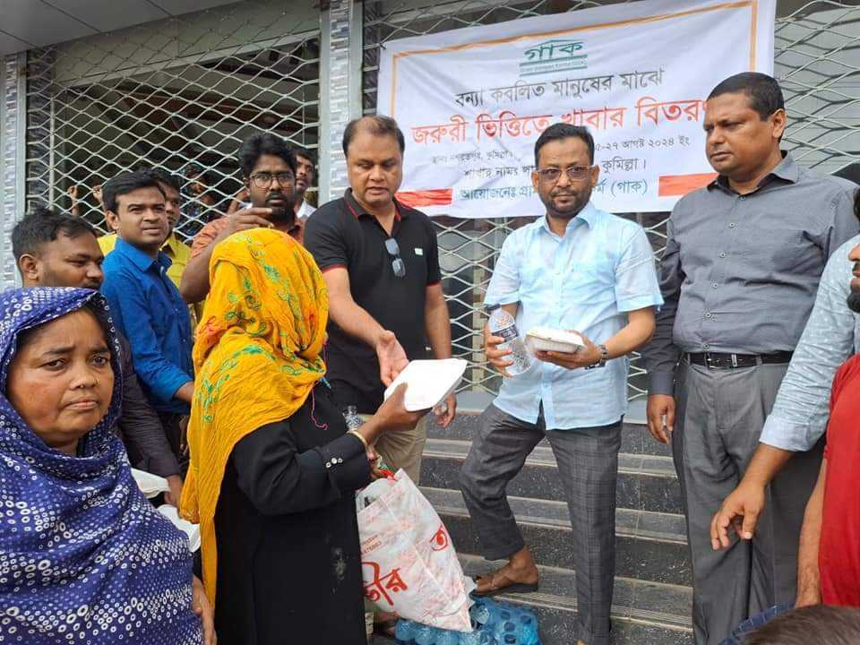 গ্রাম উন্নয়ন কর্ম (গাক) এর উদ্যোগে দেশের সাম্প্রতিক ভয়াবহ বন্যায় ক্ষতিগ্রস্ত লক্ষীপুর, কুমিল্লা, নোয়াখালী ও ফেনী জেলার বন্যা কবলিত মানুষের মাঝে একবেলা খাবার ও সুপেয় পানি সরবরাহের কার্যক্রম শুরু করা হয়েছে। বন্যা কবলিত এলাকায় অবস্থিত গাক’র ক্ষুদ্র ঋণ কার্যক্রম পরিচালিত ৭টি শাখার মাধ্যমে ২১০০০ মানুষকে একবেলা খাবার ও সুপেয় পানি সরবরাহ করার লক্ষ্যে গতকাল ২৪ আগস্ট হতে জরুরি ত্রাণ বিতরণ শুরু করা হয়। বিগত ২দিনে দূর্গত এলাকায় প্রায় ৭ হাজার মানুষের মাঝে একবেলা খাদ্য সহায়তা প্রদান করা হয়েছে।