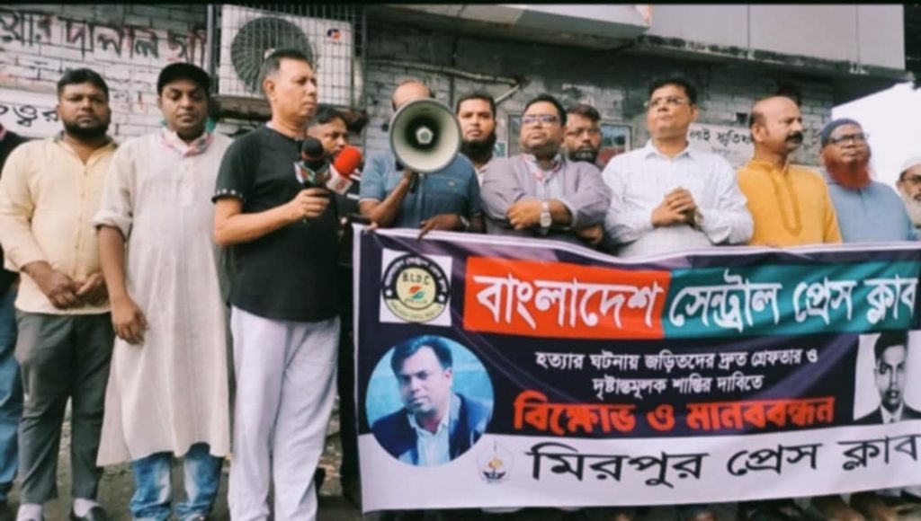 গাজীপুরে দৈনিক প্রতিদিনের কাগজ পত্রিকার সাহসী সাংবাদিক আসাদুজ্জামান তুহিন কে নির্মমভাবে হত্যা এবং দৈনিক বাংলাদেশের আলো পত্রিকার গাজীপুর প্রতিনিধি সাংবাদিক আনোয়ার হোসেন-এর ওপর মধ্যযুগীয় কায়দায় বর্বরোচিত হামলার প্রতিবাদে রাজধানীর মিরপুরে বিক্ষোভ ও মানববন্ধন কর্মসূচি পালন করেছে বাংলাদেশ সেন্ট্রাল প্রেস ক্লাব (B.C.P.C)। শুক্রবার (৮ আগস্ট) বিকেলে বাংলাদেশ সেন্ট্রাল প্রেস ক্লাব (B.C.P.C)-এর প্রতিষ্ঠাতা সভাপতি ও জাতীয় দৈনিক মাতৃজগত পত্রিকা’র সম্পাদক খান সেলিম রহমান-এর নেতৃত্বে মিরপুর ১০ নম্বর গোলচত্বরে এই মানববন্ধন ও বিক্ষোভ কর্মসূচি অনুষ্ঠিত হয়। এই সময় বক্তারা সাংবাদিক আসাদুজ্জামান তুহিন কে জবাই করে হত্যা ও সাংবাদিক আনোয়ারকে মধ্যযুগীয় কায়দায় ইট দিয়ে থেঁতলে আহত করায় তীব্র ক্ষোভ ও নিন্দা প্রকাশ করেন এবং অপরাধীদের দ্রুত গ্রেফতার করে দৃষ্টান্তমূলক শাস্তির দাবি জানান। এ-সময় বাংলাদেশ সেন্ট্রাল প্রেস ক্লাব (B.C.P.C) প্রতিষ্ঠাতা সভাপতি খান সেলিম রহমান তাঁর বক্তব্যে বলেন— “সাংবাদিকদের ওপর একের পর এক হামলা ও হত্যাকাণ্ড প্রমাণ করে যে, দেশে গণমাধ্যমকর্মীরা আজ ভয়াবহ নিরাপত্তাহীনতায় ভুগছেন। গাজীপুরে সাংবাদিক আসাদুজ্জামান তুহিন-কে নৃশংসভাবে হত্যা এবং সাংবাদিক আনোয়ার হোসেন-এর উপর বর্বরোচিত হামলা শুধু ব্যক্তি নয়—এটি গোটা সাংবাদিক সমাজ, স্বাধীন সাংবাদিকতা ও মুক্ত মত প্রকাশের উপর সরাসরি আঘাত।” “একজন সাংবাদিক তার দায়িত্ববোধ থেকে সমাজের কিছু লোকের কুৎসিত চিত্র জনসম্মুখে তুলে ধরতে চেয়েছিলেন—আর সেই দায়েই তার জীবন দিতে হলো! আরেকজনকে চাঁদাবাজির সংবাদ প্রকাশের জের ধরে পুলিশের সামনে প্রকাশ্যে ইট দিয়ে থেঁতলে রক্তাক্ত করা হলো! এটা কোনো সভ্য রাষ্ট্রে মেনে নেওয়া যায় না।” “আমি জোরালোভাবে বলতে চাই—সাংবাদিক হত্যা ও হামলার ঘটনা কোনোভাবেই আইনের আওতার বাইরে থাকতে পারে না। এই হামলার সঙ্গে জড়িত প্রতিটি অপরাধীকে দ্রুত গ্রেফতার করে দৃষ্টান্তমূলক শাস্তির আওতায় আনতে হবে।” “বাংলাদেশ সেন্ট্রাল প্রেস ক্লাব (B.C.P.C) সবসময় সত্য ও ন্যায়ের পক্ষে, এবং সাংবাদিকদের অধিকার ও নিরাপত্তার প্রশ্নে আমরা কোনো আপস করবো না। “আমি সরকারের প্রতি আহ্বান জানাচ্ছি—এই ঘটনাগুলোকে গুরুত্ব দিয়ে তদন্তের নির্দেশ দিন, দোষীদের চিহ্নিত করে দ্রুত বিচারের মুখোমুখি করুন। সাংবাদিকদের রক্ত যেন আর না ঝরে, মায়ের কোল যেন আর শূন্য না হয়।” “আমরা চাই, সাংবাদিকদের নিরাপত্তা নিশ্চিত করতে একটি স্বতন্ত্র কমিশন গঠন হোক, যেখানে প্রতিটি ঘটনার নিরপেক্ষ তদন্ত হবে। আর কোনো সাংবাদিক যেন হত্যা বা হামলার শিকার না হয়—এটাই আমাদের দৃঢ় প্রত্যয়।” প্রতিবাদ ও মানববন্ধন কর্মসূচিতে আরও উপস্থি