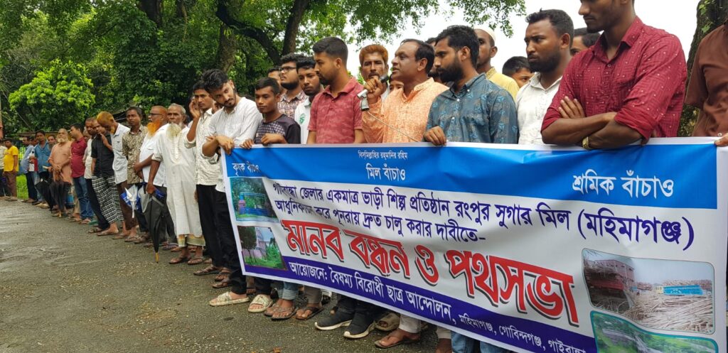 গোবিন্দগন্জ বৈষম্য বিরোধী ছাত্র আন্দলনের ডাকে মহিমাগন্জ,রংপুর সুগার মিল পুনরায় চালু করনের দাবি জানিয়ে, রংপুর সুগার মিল গেটে সর্বস্তরের জনগনের মানব বন্ধন ও বিক্ষভ কর্মসূচী পালন করেন। উক্ত কর্মসূচীতে বক্তব্য দেন রংপুর চিনি কলের শ্রমিক ইউনিয়নের সভাপতি আবু সুফিয়ান সুজা সহ ছাত্র সমাজের অন্যান্য নেতৃবৃন্দ। তারা জানান, মিলটি বন্ধ হয়ে যাওয়ার কারনে শ্রমিক কর্মচারিরা মানবেতর জীবনযাপন করছে।। এখানে উল্লেখ্য যে গাইবান্ধার গোবিন্দগঞ্জ উপজেলার মহিমাগঞ্জ ইউনিয়নে অবস্থিত জেলার একমাত্র কৃষিভিত্তিক কারখানা রংপুর সুগার মিল। এই মিলটি প্রতিষ্ঠার পর থেকে উত্তরের জনপদ গাইবান্ধার কৃষি জমিতে আখ চাষ বেড়ে যায়। কৃষকরা আখ চাষের মাধ্যম সফলতার ছোঁয়া লাগে এই মিলের অর্থনীতিতে। কিন্তু মিলটি বন্ধ হয়ে গেলে, এই অঞ্চলের কৃষিতে আখ চাষের সম্ভাবনার দুয়ার বন্ধ হয়ে যায়। এমন অবস্থায় সরকারের কাছে তাদের চাওয়া মিলটি যেন পুনরায় চালু করা হয়।। মিলটি চালু হলে দেশের অর্থনীতির গতি বৃদ্ধি পাবে বলে তারা উত্তরবঙ্গের সংবাদকে জানান।।