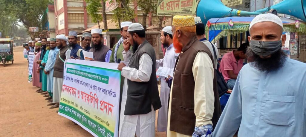কুড়িগ্রাম জেলার চিলমারীতে মসজিদ ভিত্তিক শিশু ও গণশিক্ষা কার্যক্রম প্রকল্প (৮ম পর্যায়) পাস করার দাবিতে মানববন্ধন ও স্মারকলিপি প্রদান করেন, মউশিক শিক্ষক কল্যাণ পরিষদ, বাংলাদেশ চিলমারী কুড়িগ্রাম । রবিবার সকাল ১১ টায় প্রায় ঘন্টাব্যাপি মানববন্ধন করেন শিক্ষকরা এসময় বক্তব্য রাখেন ডাঃ হাফেজ ইউসুফ আলী প্রধান উপদেষ্টা,মৌশিক শিক্ষক কল্যাণ পরিষদ,চিলমারী। মাওলানা আব্দুল্লাহ আল মামুন সভাপতি,মৌশিক শিক্ষক কল্যাণ পরিষদ,চিলমারী।