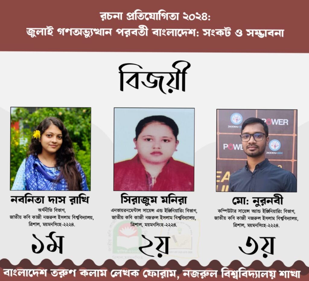 বাংলাদেশ তরুণ কলাম লেখক ফোরাম, জাতীয় কবি কাজী নজরুল ইসলাম বিশ্ববিদ্যালয় শাখার আয়োজনে অনুষ্ঠিত “জুলাই গণঅভ্যুত্থান পরবর্তী বাংলাদেশ: সংকট ও সম্ভাবনা” বিষয়ক রচনা প্রতিযোগিতায় বিজয়ীদের নাম ঘোষণা করা হয়েছে।