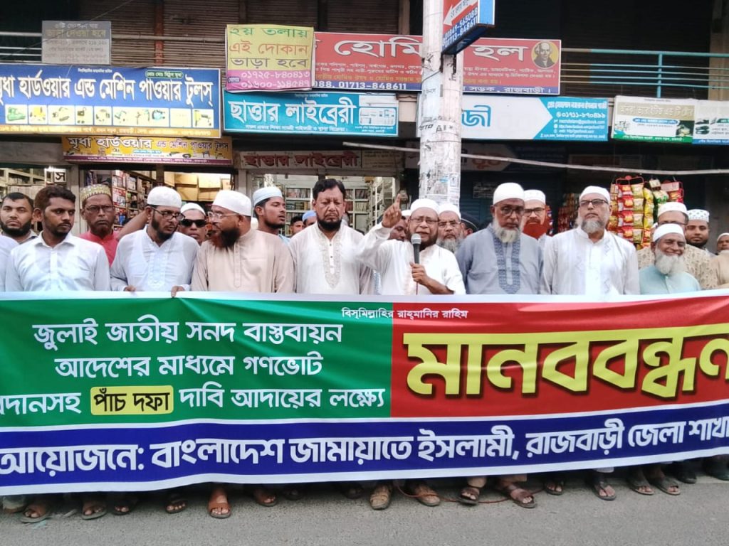 জাতীয় জুলাই সনদ, পিআর পদ্ধতিতে নির্বাচনসহ পাঁচ দফা দাবিতে রাজবাড়ী জেলা জামায়াতের উদ্যোগে মানববন্ধন কর্মসূচি পালন করা হয়েছে।