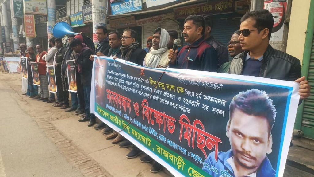 ময়মনসিংহ জেলার ভালুকায় গার্মেন্টস কর্মী দীপু চন্দ্র দাশকে ধর্ম অবমাননার অভিযোগে পিটিয়ে ও পুড়িয়ে হত্যার প্রতিবাদে ও হত্যাকারীদের বিচার দাবিতে রাজবাড়ীতে মানববন্ধন কর্মসুচী পালিত হয়েছে।
