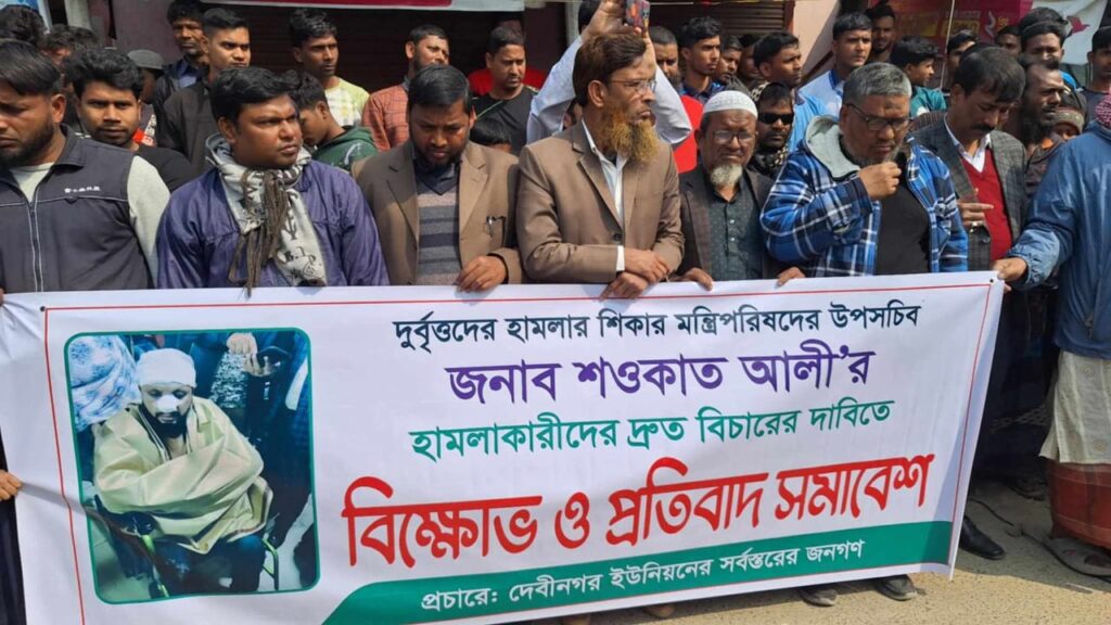 সদর চাঁপাইনবাবগঞ্জের দেবীনগর ইউনিয়ন ধুলাউড়ির হাটে উপসচিব শওকত আলীর মানববন্ধন অনুষ্ঠিত হয়েছে। রবিবার ২৬ তারিখ বিকাল ৪ টায় রাজধানীর চকবাজারে নিষিদ্ধ পলিথিন কারখানায় অভিযান শেষে ফেরার পথে হামলার শিকার হয়েছেন পরিবেশ অধিদপ্তরের পরিচালক (মনিটরিং অ্যান্ড এনফোর্সমেন্ট) উপসচিব শওকত আলী। একজন সৎ এবং নিরহংকার বিনয়ী মানুষ হিসাব দীর্ঘদিন তানোর উপজেলার ইউএনও হিসেবে অনেক ভালো কাজের সুনাম কুড়িয়েছেন। মানববন্ধনে উপস্থিত ছিলেন দেবীনগর ইউনিয়ন পরিষদের সাবেক চেয়ারম্যান আ ক ম শাহেদুল আলম বিশ্বাস পলাশ, দেবীনগর ডিয়ার উচ্চ বিদ্যালয় এর অধ্যক্ষ জনার সাজেমান আলী , দেবীনগর দ্বিমুখে মাধ্যমিক বিদ্যালয়ের প্রধান শিক্ষক আব্দুল আজিজ, দেবীনগর উচ্চ বিদ্যালয় এর প্রধান শিক্ষক জনাব আব্দুল জব্বার, দেবীনগর আল মাদ্রাসা তুস সালাফিয়ার প্রিন্সিপাল জনাব শফিকুল ইসলাম, সমাজসেবক মাইনুল ইসলাম, জহুরুল ইসলাম,আরব আলী, নূর মোহাম্মদ এবং দেবীনগর ইউনিয়নের সকল শিক্ষক মন্ডলী ছাত্র-ছাত্রী ও এলাকার গণ্যমান্য ব্যক্তিবর্গরা।