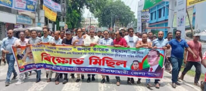 দেশনায়ক তারেক রহমান এর বিরুদ্ধে অপপ্রচার ও মিটফোর্ড সহ সারাদেশের সকল হত্যাকান্ডের বিচারের দাবিতে নীলফামারী জেলা যুবদলের বিক্ষোভ প্রতিবাদ সমাবেশে জেলা বিএনপির সদস্য সচিব সাইফুল্লাহ রুবেল বলেছে দেশকে গতিশীল করতে নির্বাচনের বিকল্প নেই। ১৭ জুলাই বৃহস্পতিবার সকালে জেলা বিএনপির কার্যালয় থেকে যুবদলের একটি বিশাল প্রতিবাদ মিছিল শহরের প্রধান প্রধান সড়ক প্রদক্ষিণ করে দলীও কার্যালয়ে এসে সমবেত হয়। জেলা যুবদলের সভাপতি ও সদ্য জেলা বিএনপির সদস্য সচিব এএইচ এম সাইফুল্লাহ রুবেল এর সভাপতিত্বে ও শাহাদাত হোসেন চৌধুরীর সঞ্চালনায় বক্তব্য রাখেন জেলা বিএনপির আহবায়ক মো, মীর সেলিম ফারুক, যুগ্ম আহবায়ক মোস্তফা প্রধান বাচ্চু, বিএনপি নেতা আনিছুর রহমান কোকো, সদর উপজেলা যুবদলের সদস্য সচিব রাশেদ রেজা উদ-দৌলা, জেলা যুগ্ম সাধারণ সম্পাদক রায়হান ইসলাম কাল্লু, জেলা সাংগঠনিক সম্পাদক জাহাঙ্গীর আলম লালটু প্রমুখ। জেলা সভাপতি এএইচ এম সাইফুল্লাহ রুবেল তার শুভেচ্ছা বক্তব্যে জেলা যুবদলের প্রতিটি ইউনিটের নেতাকর্মীদের ধন্যবাদ দিয়ে বলেন, একটি পক্ষ দেশনায়ক তারেক রহমান ও জুলাই আন্দোলনে বিএনপির অংশগ্রহণ নিয়ে অপপ্রচার চালাচ্ছেন,সেই বিষয়ে সকলকে সজাগ থাকতে হবে।২০১৪ সালের নির্বাচনে ফ্যাসিস্ট শেখ হাসিনা যখন মিথ্যা আশ্বাস দিলেন ডিজিটাল বাংলাদেশের তখন দেশনেত্রী বেগম খালেদা জিয়া বলেন, দেশ বাঁচাও মানুষ বাচাও, আমরা দেশনায়ক তারেক রহমান এর নির্দেশনায় জুলাই আগস্ট আন্দোলনে ঝাপিয়ে পরি এবং ফ্যাসিস্ট হাসিনা দেশথেকে পালাতে বাধ্য হন। একটি গণতান্ত্রিক দেশ কেবলমাত্র নির্বাচিত সরকারের দাড়া নিরাপদ তাই নির্বাচনের বিকল্প নেই। বিক্ষোভ মিছিলে জেলা সহ পৌর উপজেলা ছাড়াও ডোমার ডিমলা জলঢাকা উপজেলার নেতাকর্মীরা অংশগ্রহণ করে।