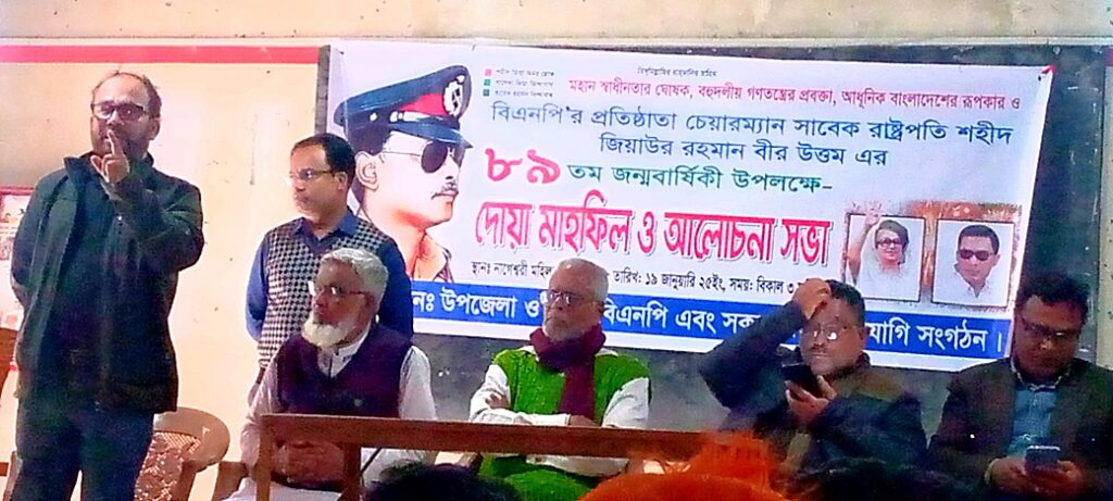 আলোচনা সভা ও দোয়া মাহফিলের মধ্যে দিয়ে মহান স্বাধীনতার ঘোষক, বহুদলীয় গণতন্ত্রের প্রবক্তা, আধূনিক বাংলাদেশের রুপকার ও বিএনপি’র প্রতিষ্ঠাতা চেয়ারম্যান সাবেক রাষ্ট্রপ্রতি শহীদ জিয়াউর রহমান বীর উত্তম এর ৮৯তম জন্মবার্ষিকী পালন করা হয়েছে । রবিবার (১৯জানুয়ারি) বিকেল ৩টায় কুড়িগ্রামের নাগেশ্বরী মহিলা ডিগ্রি কলেজে হলরুমে উপজেলা ও পৌর বিএনপি এবং সকল সহযোগি সংগঠনের আয়োজনে এ আলোচনা সভা ও দোয়া মাহফিল অনুষ্ঠিত হয়।