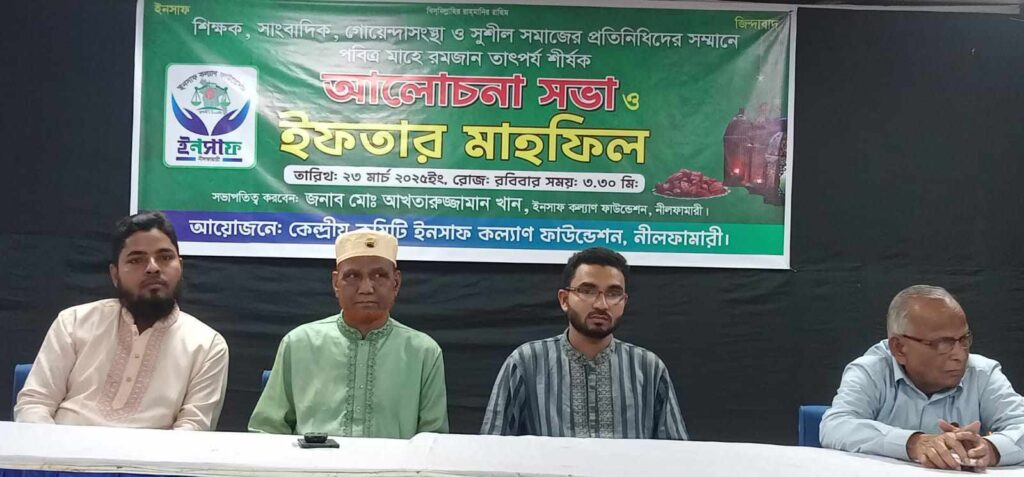 নীলফামারী প্রতিনিধি:নীলফামারীতে ইনসাফ কল্যাণ ফাউন্ডেশনের আয়োজনে পবিত্র মাহে রমজান তাৎপর্য শীর্ষক আলোচনা সভা ও ইফতার মাহফিল অনুষ্ঠিত হয়েছে।