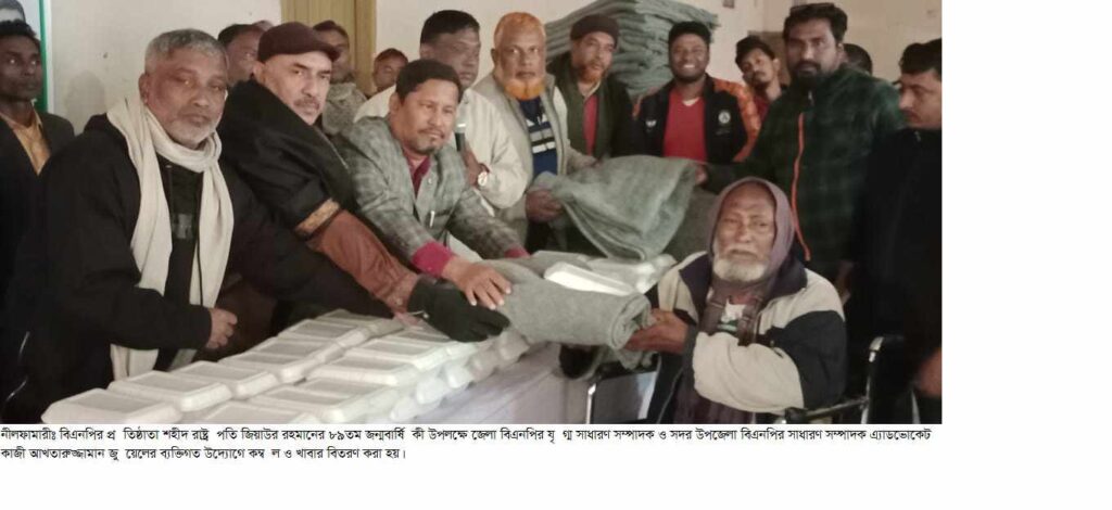 স্বপ্না আক্তার, নীলফামারীঃবাংলাদেশ জাতীয়তাবাদী দল (বিএনপি) এর প্রতিষ্ঠাতা শহীদ রাষ্ট্রপতি জিয়াউর রহমানের ৮৯তম জন্মবার্ষিকী উপলক্ষে নীলফামারীতে অসহায় দরিদ্র ও শীতার্ত মানুষের মাঝে কম্বল ও রান্না করা খাবার বিতরণ করা হয়েছে। আজ সোমবার বিকেলে জেলা শহরের নতুনবাজার হোলসেল মার্কেট প্রাঙ্গনে জেলা বিএনপির যৃগ্ম সাধারণ সম্পাদক ও সদর উপজেলা বিএনপির সাধারণ সম্পাদক এ্যাডভোকেট কাজী আখতারুজ্জামান জুয়েলের ব্যক্তিগত উদ্যোগে কম্বল ও খাবার বিতরণ করা হয়। জেলা বিএনপির সহ-সভাপতি মোজাম্মেল হক ও সাংগঠনিক সম্পাদক আনিসুর রহমান কোকো, জেলা কৃষকদলের সভাপতি মগনি মাসুদুল আলম দুলাল, সদর উপজেলা বিএনপির সাংগঠনিক সম্পাদক মশগুল ইসলাম, জাতীয়তাবাদী আইনজীবী ফোরামের সাধারণ সম্পাদক আসাদুজ্জামান খান রিনো, গোড়গ্রাম ইউনিয়ন বিএনপির সাধারণ সম্পাদক মতিউর রহমান, ইটাখোলা ইউনিয়ন বিএনপির সাধারণ সম্পাদক কাওসার, কুন্দপুকুর ইউনিয়ন বিএনপির সাধারণ সম্পাদক কালাম আলোচনা সভায় বক্তব্য দেন। নীলফামারী পৌর তাঁতীদলের সভাপতি শাহরিয়ার হোসেন হাবিলের সঞ্চালনায় আলোচনা অনুষ্ঠানে সভাপতিত্ব করেন নীলফামারী পৌর শ্রমিকদলের আট নং ওয়ার্ড সভাপতি আনোয়ার হোসেন।
