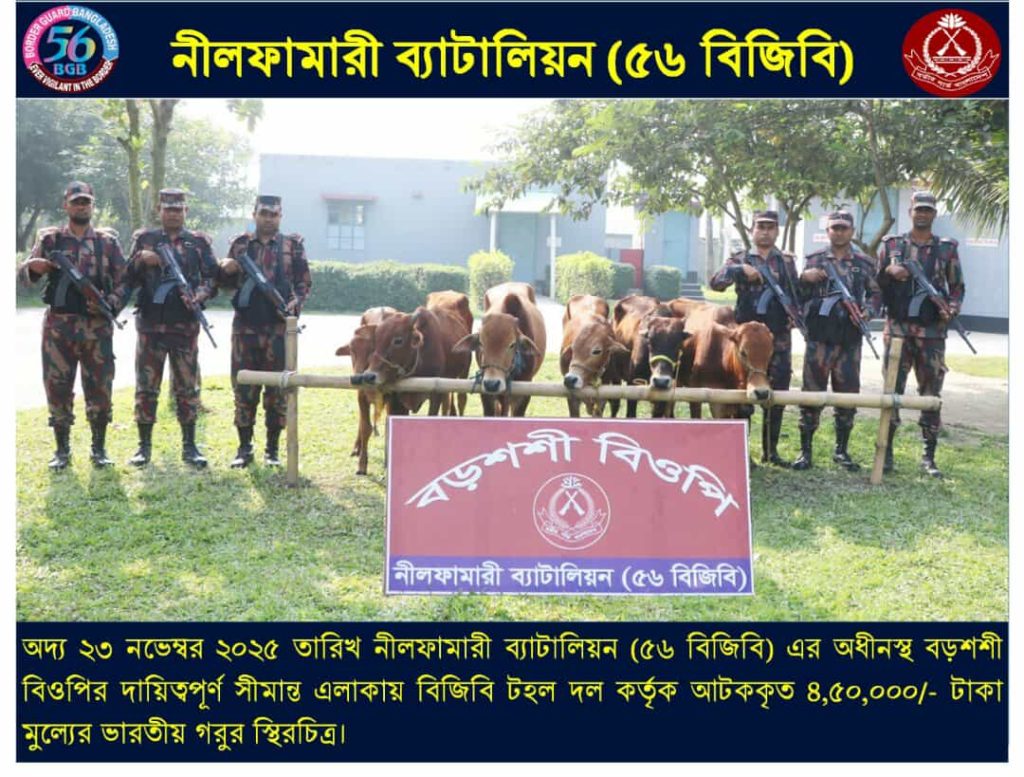বিজিবি সূত্রে জানা যায়, বড়শশী বিওপির একটি বিশেষ টহল দল গোপন তথ্যের ভিত্তিতে সীমান্ত এলাকায় অভিযান পরিচালনা করে। এসময় ভারত থেকে অবৈধ পথে আনা মালিকবিহীন ছয়টি গরু আটক করতে সক্ষম হয় তারা। আটক গরুগুলোর আনুমানিক মূল্য প্রায় ৪ লাখ ৫০ হাজার টাকা।