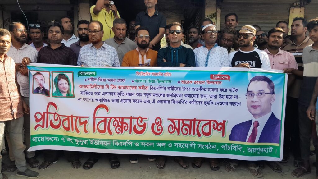 জয়পুরহাটের পাঁচবিবি উপজেলায় জামায়াত ইসলামী কর্তৃক বিএনপি নেতাকর্মীদের ওপর হামলা ও হুমকির প্রতিবাদে বিক্ষোভ সমাবেশ করেছে বিএনপি। শনিবার (২৯ মার্চ) বিকেলে কুসুম্বা ইউনিয়ন বিএনপি ও সকল অঙ্গ ও সহযোগী সংগঠনের আয়োজনে শালাইপুর বাজারে এ বিক্ষোভ সমাবেশ অনুষ্ঠিত হয়।