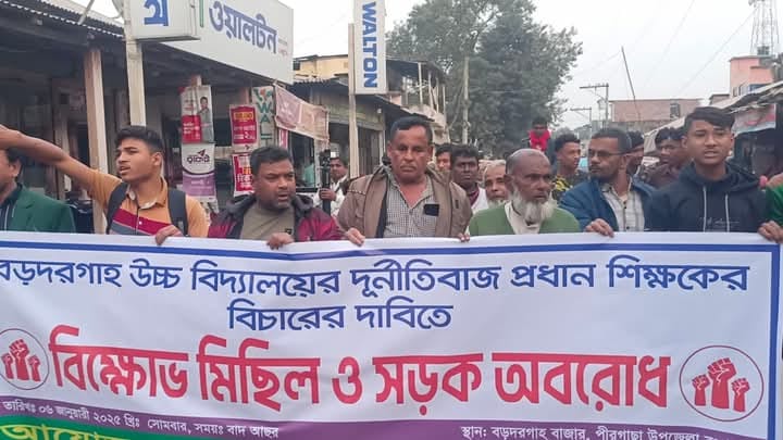 রংপুরের পীরগাছা উপজেলার ১নং কল্যাণী ইউনিয়নের বড় দরগাহ উচ্চ বিদ্যালয়ের দুর্নীতিবাজ প্রধান শিক্ষকের বিচারের দাবিতে বিক্ষোভ মিছিল ও সড়ক অবরোধ কর্মসূচী পালন করে বৈষম্য বিরোধী ছাত্রজনতা।