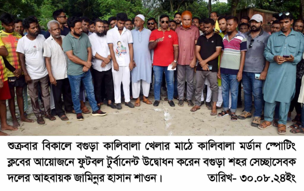 শুক্রবার বিকালে বগুড়া কালিবালা খেলার মাঠে কালিবালা মর্ডান স্পোটিং ক্লাবের আয়োজনে ফুটবল টুর্নামেন্টের উদ্বোধন করেন বগুড়া শহর সেচ্ছাসেবক দলের আহবায়ক জামিনুর হাসান শাওন। খেলায় প্রধান অতিথি হিসেবে উপস্থিত ছিলেন বগুড়া জেলা স্বেচ্ছাসেবক দলের আহবায়ক রাকিবুল ইসলাম শুভ।বরেণ্য অতিথি হিসেবে উপস্থিত ছিলেন বগুড়া জেলা স্বেচ্ছাসেবক দলের সদস্য সচিব আবু হাসান।