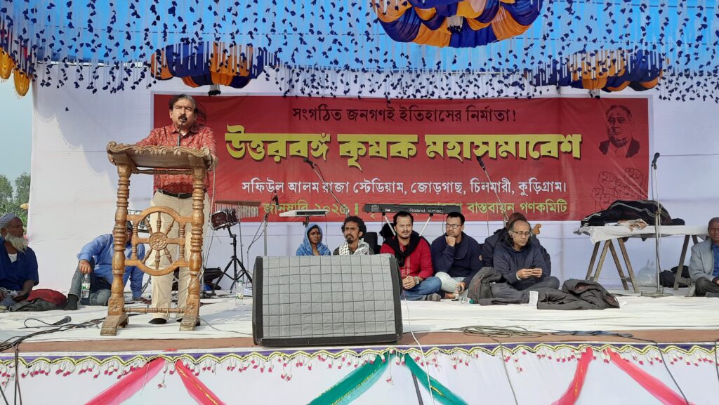 বাংলাদেশের হাটঘাটে ইজারা প্রথা বাতিল করতে হবে। যে কৃষকের শ্রমে ঘামে ফসল উৎপন্ন হয় সেই কৃষকের জন্য কালা আইন বীজ বিপনন ও কৃষি বীজ আইন ২০১৮ বাতিল করতে হবে। সরকার কৃষকের নামে প্রতি বছর ভর্তুকী হিসেবে ৪০ হাজার কোটি টাকা বরাদ্দ করে আমার কৃষককে না দিয়ে, বিদেশী করপোরেশন বিভাগকে দেয়। যেখানে আমার কৃষককে মাত্র ৫০০ টাকা ঋণের জন্য আইন শৃংখলা বাহিনী কোমড়ে দড়ি বেঁধে নিয়ে যায়। রবিবার দুপুরে কুড়িগ্রামের চিলমারী উপজেলার জোড়গাছ বাজার সংলগ্ন ব্রহ্মপূত্র নদ তীরবর্তী শফিউল আলম রাজা স্টেডিয়াম মাঠে প্রধান অতিথির বক্তব্যে এসব কথা বলেন, রাষ্ট্র সংস্কার আন্দোলনের প্রধান সমন্বয়ক এডভোকেট হাসনাত কাইয়ূম। তিনি আরো বলেন, ‘সবচাইতে বেশী খাজনা তোলা হয় খেটে খাওয়া মানুষের কাছ থেকে অদৃশ্য খাজনা হিসেবে। প্রত্যেকটা প্রয়োজনীয় জিনিষ থেকে সরকার প্রতি বছর ৮ লক্ষ কোটি টাকা খাজনা তুলে নেয়। এই খাজনা তুলে নিয়ে উপদেষ্টারা এখন নাকি হেলিকপ্টারে চড়ে বেড়ায়। কৃষকের খাজনার টাকা দিয়ে আফিসারদের গাড়ি কিনে দেয়া হয়। তারা গাড়ি চালায়, তাদেরকে তেল কিনে দেয়া হয়। ঢাকা শহরে দুইতলা তিনতলা রাস্তা নির্মানে যোগান দেয়া হয় বলে জানান তিনি। মহাসমাবেশে উত্তরবঙ্গ কৃষক মহাসমাবেশ কমিটির আহবায়ক নাহিদ হাসান নলেজের সভাপতিত্বে অনুষ্ঠানে উপস্থিত থেকে বক্তব্য রাখেন, নগর পরিকল্পনাবিদ নিয়াজ রহমান, শিক্ষা ও শিশু সুরক্ষা আইন (শিশির) এর আহবায়ক রাখাল রাহা, অর্থনীতিবিদ দিদারুল ভূইয়া, অনুষ্ঠানের সদর্স্য সচীব আমিনুল ইসলাম বীর, চিলমারী প্রেসক্লাবের সভাপতি নজরুল ইসলাম সাবু, প্রেসক্লাব চিলমারীর সভাপতি মনিরুল আলম লিটু, চিলমারী সাংবাদিক ফোরামের সভাপতি সাওরাত হোসেন সোহেল প্রমূখ। বক্তারা বলেন, দেশ ভাগের পর বিভিন্ন আন্দোলনে কৃষকরা প্রাণ দিলেও সেই কৃষককে কোন সরকার মর্যাদা দেয় নাই। তাদের রক্ত চুষে সরকাররা বিদেশী কোম্পনাী গুলোকে সুবিধা দিলেও আমাদের কৃষককে সব সময় বঞ্চিত থাকতে হয়েছে। বিভিন্ন কোম্পানী গুলো এখন সার-বীজ-কীটনাশকের ব্যবসা করে জমির উর্ভরতা নষ্ট করলেও সরকার তাদের বিরুদ্ধে কোন আইনী পদক্ষেপ নেয় নাই। এখানকার তাঁতী-জেলে-কৃষক সমাজ মহাজনদের হাতে জিম্মি হয়ে আছেন। কৃষক বাঁচলে দেশ বাঁচবে, দেশকে বাঁচাতে হলে আমাদের ১২দফা দাবী মেনে নিতে হবে। তাহলে অন্তর্বতী সরকারের যে সংস্কার আইন পরিকল্পনা রয়েছে তা বাস্তবায়ন হবে। কখনোই কৃষককে বাদ দিয়ে সংস্কার আইন আমরা মেনে নিবো না, মেনে নিতে পারি না। দাবি বাস্তবায়নে উত্তরবঙ্গ মহাসমাবেশ হাওর-বাওরসহ সারাদেশে ছড়িয়ে দেয়া হবে বলে জানান তারা।