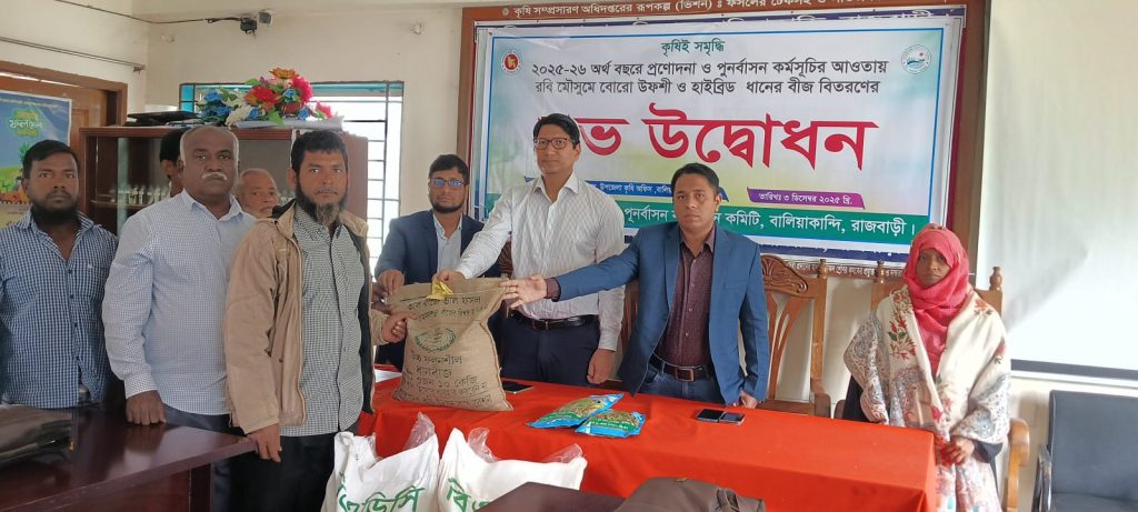 রাজবাড়ীর বালিয়াকান্দিতে ২০২৫-২৬ অর্থবছরে প্রণোদনা ও পুনর্বাসন কর্মসূচির আওতায় রবি মৌসুমে বোরো উফশী ও হাইব্রিড ধানের বীজ বিতরণের উদ্ধোধন করা হয়েছে।