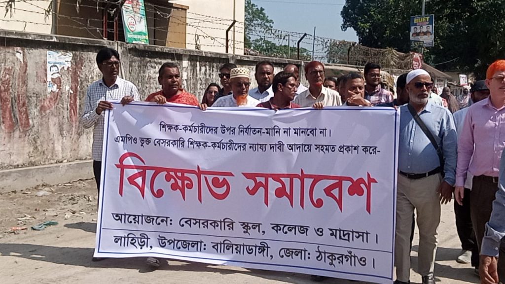 ন্যায্য দাবিতে ঠাকুরগাঁওয়ের বালিয়াডাঙ্গী উপজেলার লাহিড়ী বহুমুখী উচ্চ বিদ্যালয় ও লাহিড়ী ডিগ্রী কলেজ, মাদ্রাসার আন্দোলনরত শিক্ষক কর্মচারীদের উপর নগ্ন হামলার প্রতিবাদে বালিয়াডাঙ্গী উপজেলার শিক্ষক কর্মচারীদের বিশাল বিক্ষোভ মিছিল অনুষ্ঠিত হয়েছে। প্রজ্ঞাপন জারি সহ নানা দাবিতে লাহিড়ী বহুমুখী উচ্চ বিদ্যালয় মাঠ থেকে একটি রেলি বের হয়ে লাহিড়ী বাজারের প্রধান প্রধান সড়ক প্রদক্ষিণ করে লাহিড়ী বাজারের চৌরাস্তা মোড়ে বুধবার (১৫ অক্টোবর) এই কর্মসূচী পালিত হয়। ধনতলা উচ্চ বিদ্যালয় সহকারী শিক্ষক মাসুম মাস্টারের সঞ্চালনায় উপজেলা শিক্ষক কর্মচারী ফোরামের আয়োজনে, বালিয়াডাঙ্গী উপজেলায় কর্মরত এমপিও ভুক্ত সকল শিক্ষা প্রতিষ্ঠানের শিক্ষক কর্মচারীদের বিক্ষোভ সমাবেশ উপস্থিত থেকে বক্তব্য রাখেন লাহিড়ী ডিগ্রি কলেজের অধ্যক্ষ, মোঃ নুরুল হক, রায়মহল উচ্চ বিদ্যালয়ের প্রধান শিক্ষক বাজসা, মাচখুড়িয়া উচ্চ বিদ্যালয়ের সহকারী শিক্ষক আবু সুফিয়ান, লাহিড়ী ফাজিল মাদ্রাসার সুপার নুরুল ইসলাম, মুধুপুর উচ্চ বিদ্যালয়ের সহকারী শিক্ষক আব্দুস সবুর, ও ১ নং পাড়িয়া ইউনিয়ন বিএনপির সভাপতি ও লাহিড়ী বহুমুখী উচ্চ বিদ্যালয়ের প্রধান শিক্ষক এডভোকেট জিল্লুর রহমান সহ আরো অনেকেই। এসময়ে বিক্ষোভ সমাবেশে বিভিন্ন স্কুল মাদ্রাসা ও কলেজ থকে আগত শিক্ষক শিক্ষিকা ও কর্মচারীরা উপস্থিত ছিলেন।