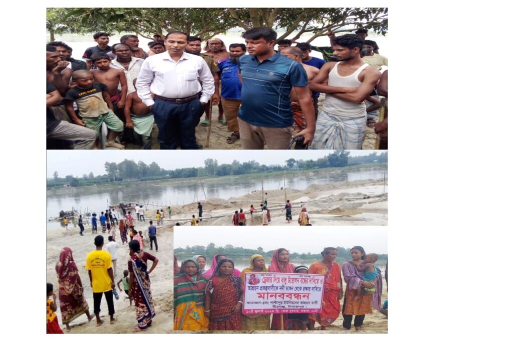 বীরগঞ্জে ড্রেজার দিয়ে বালু উত্তোলন বন্ধের দাবীতে মানববন্ধন