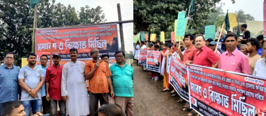 ‘‘ধর্মীয় রাষ্ট্র নয়, ধর্ম নিরপেক্ষ রাষ্ট্র চাই, ধর্ম যার যার রাষ্ট্র সবার’’ এই প্রতিপাদ্যকে সামনে রেখে দিনাজপুরের বীরগঞ্জে বাংলাদেশ হিন্দু বৌদ্ধ খ্রিষ্টান ঐক্য পরিষদ ও বাংলাদেশ পুজা উৎযাপন পরিষদ বীরগঞ্জ উপজেলা শাখার আয়োজনে বিজয় চত্ত¦রের সামনে, অনতিবিলম্বে সাম্প্রদায়িক হামলা বন্ধ, হামলাকারীদের চিহ্নিত করে গ্রেপ্তার ও বিচার এবং হামলায় ক্ষতিগ্রস্থদের ক্ষতিপুরণ প্রদান এবং বাস্তুহারাদের জায়গা জমি ফিরিয়ে দেওয়ার সরকারি পদক্ষেপ গ্রহনের দাবিতে সমাবেশ ও বিক্ষোভ মিছিল অনুষ্ঠিত হয়েছে।