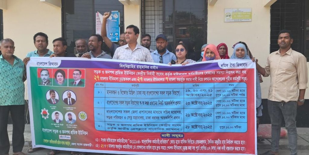 বাংলাদেশ সড়ক ও জনপথ শ্রমিক ইউনিয়ন কেন্দ্রীয় নির্বাহী সংসদ মাষ্টাররোলভুক্ত কর্মচারীদের বেতন বৈষম্য নিরসন, পেনশন সুবিধা প্রদান এবং ২৭ মামলার নীতিমালা চূড়ান্তকরণসহ সাত দফা দাবিতে দেশব্যাপী আন্দোলনের ঘোষণায় একাত্ম প্রকাশ করে বিক্ষোভ ও মানববন্ধন করেছেন রাজবাড়ী জেলা শাখা।