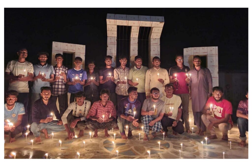 প্রজ্বলিত মোমবাতি হাতে নিয়ে এক মিনিট নীরবতা ও শহিদদের রুহের মাগফেরাত কামনা করে দোয়া মোনাজাত করা হয়। এতে বিভিন্ন শ্রেণি-পেশার মানুষ অংশগ্রহণ করেন।