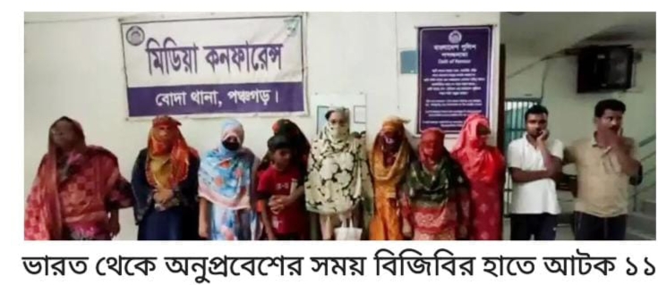 পঞ্চগড়ে ভারত থেকে অনুপ্রবেশের সময় নারী ও শিশুসহ ১১ জন বাংলাদেশিকে আটক করেছে বর্ডার গার্ড বাংলাদেশ (বিজিবি)। আটক ব্যক্তিদের মধ্যে দুজন পুরুষ, আটজন নারী ও এক শিশু রয়েছে। তাঁরা নারায়ণগঞ্জ, নোয়াখালী, নরসিংদী, খুলনা, ফরিদপুর, সাতক্ষীরা ও যশোর জেলার বাসিন্দা বলে জানা গেছে।