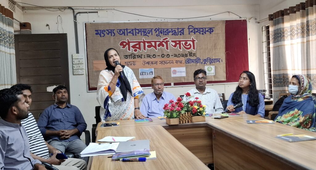 কুড়িগ্রামের রৌমারীতে মৎস্য আবাসস্থল পূনরুদ্ধার বিষয়ক পরামর্শ সভা অনুষ্ঠিত হয়েছে। রবিবার (২৩ মার্চ) সকাল ১০ টার দিকে আরডিআরএস বাংলাদেশ ট্রোসা-২ প্রকল্প এর আয়োজনে উপজেলা পরিষদ সম্মেলন কক্ষে প্রান্তিক জেলে, শিক্ষক, স্থানীয় গণ্যমান্য ব্যাক্তি বর্গকে নিয়ে পরামর্শ বিষয়ক এক আলোচনা সভা অনুষ্ঠিত হয়।