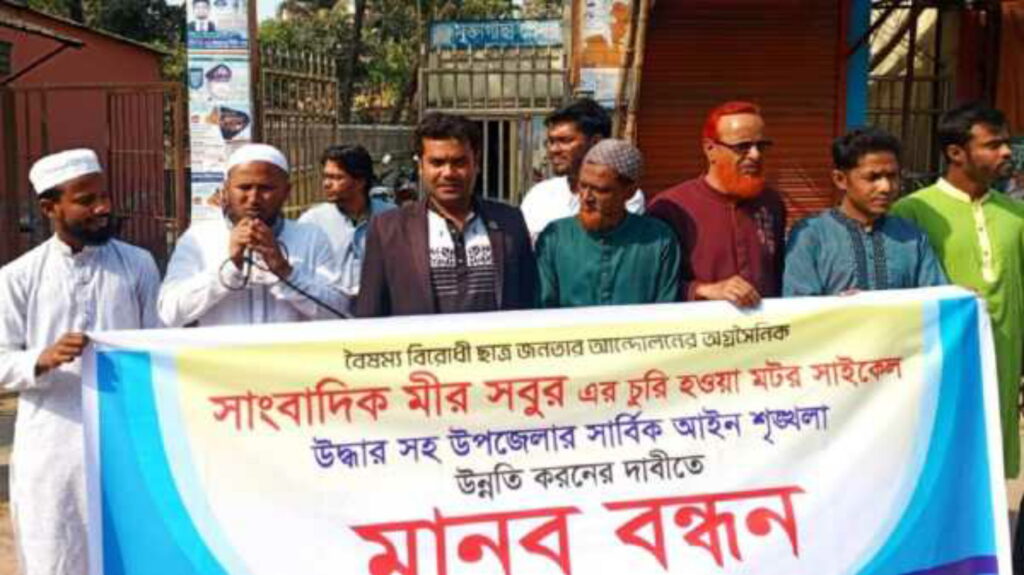 ময়মনসিংহের মুক্তাগাছা উপজেলায় সাংবাদিক মীর সবুর আহম্মেদের মোটরসাইকেল চুরি ও আইনশৃঙ্খলা পরিস্থিতির অবনতি নিয়ে উদ্বেগ প্রকাশ করে মানববন্ধন অনুষ্ঠিত হয়েছে।