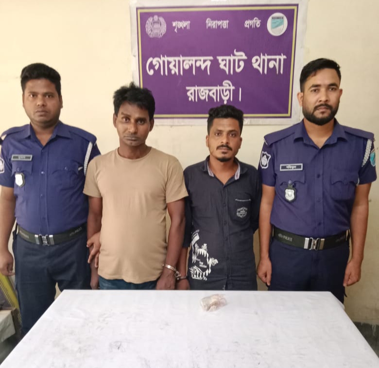 গ্রেপ্তারকৃতরা হলো, গোয়ালন্দ ঘাট থানার দৌলতদিয়া ইউনিয়ন পরিষদের পার্শ্বে সুনালী ফকির পাড়ার মোঃ হারুন মোল্লার ছেলে মোঃ সাইদুল মোল্লা (২৮), মানিকগঞ্জ জেলার শিবালয় থানার শিবালয় গ্রামের মৃত আনছার আলী মল্লিকের ছেলে মোঃ হাবিবুর রহমান (৪৪)।