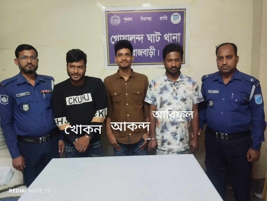 গোয়ালন্দ ঘাট থানার অফিসার ইনচার্জ (ওসি) মোহাম্মদ রাকিবুল ইসলাম বলেন, এসআই সেলিম মোল্যা সঙ্গীয় অফিসার ও ফোর্স সহ গোয়ালন্দ ঘাট থানার বৃহস্পতিবার (৬মার্চ) দায়েরকৃত মারামারি মামলা দায়ের হয়। ওই মামলার আসামী মোঃ আরিফুল ইসলাম শান্ত, মোঃ সাফায়েত আকন্দ, খোকনকে গোয়ালন্দঘাট থানার দৌলতদিয়া পূর্বপাড়া পতিতাপল্লির মধ্যে রাশিদার বাড়ী থেকে গ্রেপ্তার করে। শুক্রবার সকালে তাদেরকে রাজবাড়ী আদালতে প্রেরণ করা হয়েছে।