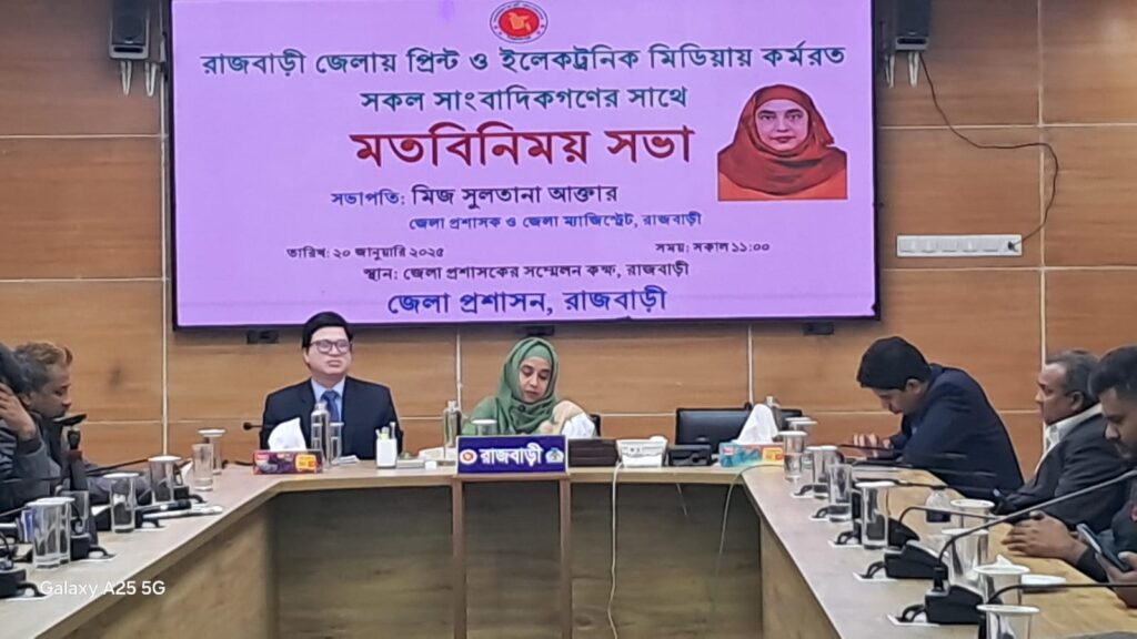 সোমবার (২০ জানুয়ারি) দুপুরে জেলা প্রশাসকের কার্যালয়ের সম্মেলন কক্ষে নবাগত জেলা প্রশাসক মিজ সুলতানা আক্তারের সভাপতিত্বে মতবিনিময় সভায় বক্তব্য রাখেন, অতিরিক্ত জেলা প্রশাসক মোঃ তারিফ উল হাসান, রাজবাড়ী প্রেস ক্লাবের সহ-সাধারণ সম্পাদক মোঃ জাহাঙ্গীর হোসেন, শহিদুল ইসলাম হিরন, রাজবাড়ী জেলা রিপোর্টার্স ক্লাবের সাধারণ সম্পাদক সোহেল রানা, সহ-সভাপতি মেহেদী হাসান, জেলা মফস্বল সাংবাদিক ফোরামের সভাপতি মোঃ কবির হোসেন, সাংবাদিক দেবাশীষ বিশ্বাস, শেখ রনজু আহম্মেদ, আব্দুল মালেক, খন্দকার রবিউল ইসলাম, মোঃ ফজলুল হক, নুরুল ইসলাম, মোঃ আমিরুল হক, ইমদাদুল হক রানা’সহ জেলায় কর্মরত প্রিন্ট ও ইলেকট্রনিক মিডিয়ার সাংবাদিকরা প্রমুখ।
