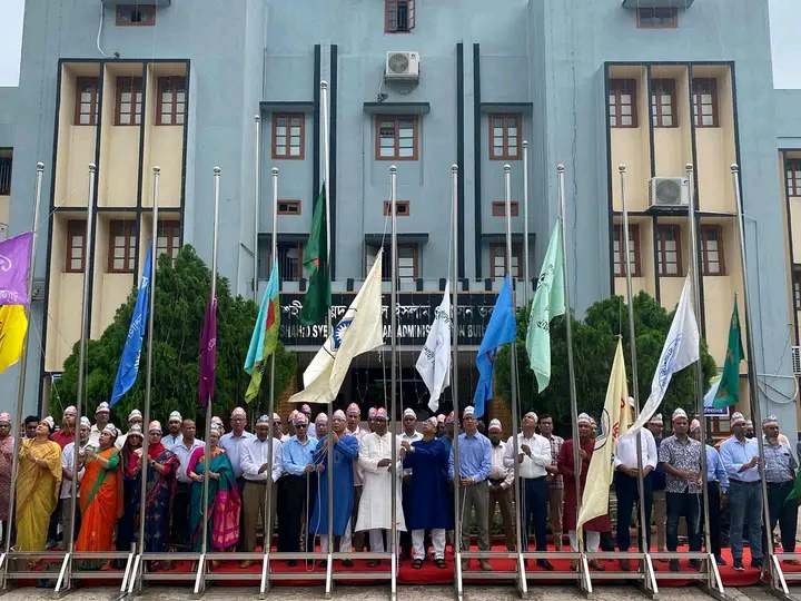 এর আগে দিবসের শুরুতে সকাল ১০টায় সমবেত কণ্ঠে জাতীয় সংগীত পরিবেশন করা হয়। এ সময় বিশ্ববিদ্যালয়ের উপাচার্য অধ্যাপক গোলাম সাব্বির সাত্তার জাতীয় পতাকা, প্রতিষ্ঠা বার্ষিকী উদযাপন কমিটির সদস্য উপ-উপাচার্য অধ্যাপক হুমায়ুন কবীর ও উপ-উপাচার্য অধ্যাপক সুলতান-উল-ইসলাম বিশ্ববিদ্যালয়ের পতাকা এবং হল প্রাধ্যক্ষবৃন্দ নিজ নিজ হলের পতাকা উত্তোলন করেন। পরে এক বর্ণাঢ্য শোভাযাত্রা ক্যাম্পাসের গুরুত্বপূর্ণ সড়ক প্রদক্ষিণ করে। এ শোভাযাত্রায় ক্যাম্পাসের বিভিন্ন সংগঠন ও অংশ নেয়।