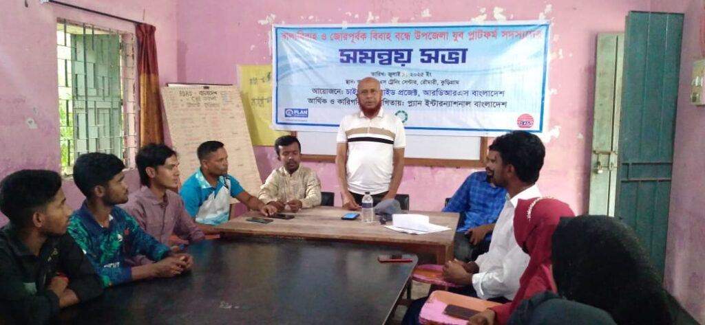 অদ্য ১৬/০৭/২৫ ইং রোজ বুধবার রৌমারী উপজেলায় আরডিআরএস বাংলাদেশে ট্রেনিং সেন্টারে চাইল্ড,নট ব্রাইড প্রজেক্ট আরডিআরএস বাংলাদেশ এর আয়োজনে প্ল্যান ইন্টারন্যাশনাল বাংলাদেশ এর আর্থিক ও কারিগরী সহযোগিতায় বাল্যবিবাহ ও জোড়পূর্বক বিবাহ বন্ধে উপজেলা যুব প্লাটফর্ম সদস্যদের সমন্বয় সভা অনুষ্ঠিত হয়। এতে ৬ টি যুব সংগঠনের সভাপতি সহ সংগঠনে থাকা গুরুত্বপূর্ণ সদস্যদরা অংশগ্রহণ করেন। বাল্যবিবাহ নিরোধ আইন ২০১৭, শতভাগ শিশুর জন্মনিবন্ধন, বিবাহ রেজিস্ট্রেশন , সেফগার্ডিং, বাল্যবিবাহ ও জোড়পূর্বক বিবাহ বন্ধ, বেকার সমস্যা দূরীকরণে গবাদি পশুপালন,মোটাতাজাকরনে নানামুখী প্রশিক্ষণ এবং সচেতনতামূলক বিষয়ে যুব সংগঠনের সদস্যদের সাথে ব্যাপক আলোচনা করা হয়। এতে উপস্থিত ছিলেন রৌমারী উপজেলার যুব কর্মকর্তা আহসান হাবিব। সিএনবি প্রকল্পের ফিল্ড ফেসিলিটেটর শাহিনুর রহমান, জীবন চন্দ্র, হাসান আলী এবং রৌমারী উপজেলা যুব প্লাটফর্মের সভাপতি মোনতাজুর রহমানসহ অন্যান্য সদস্যরা।