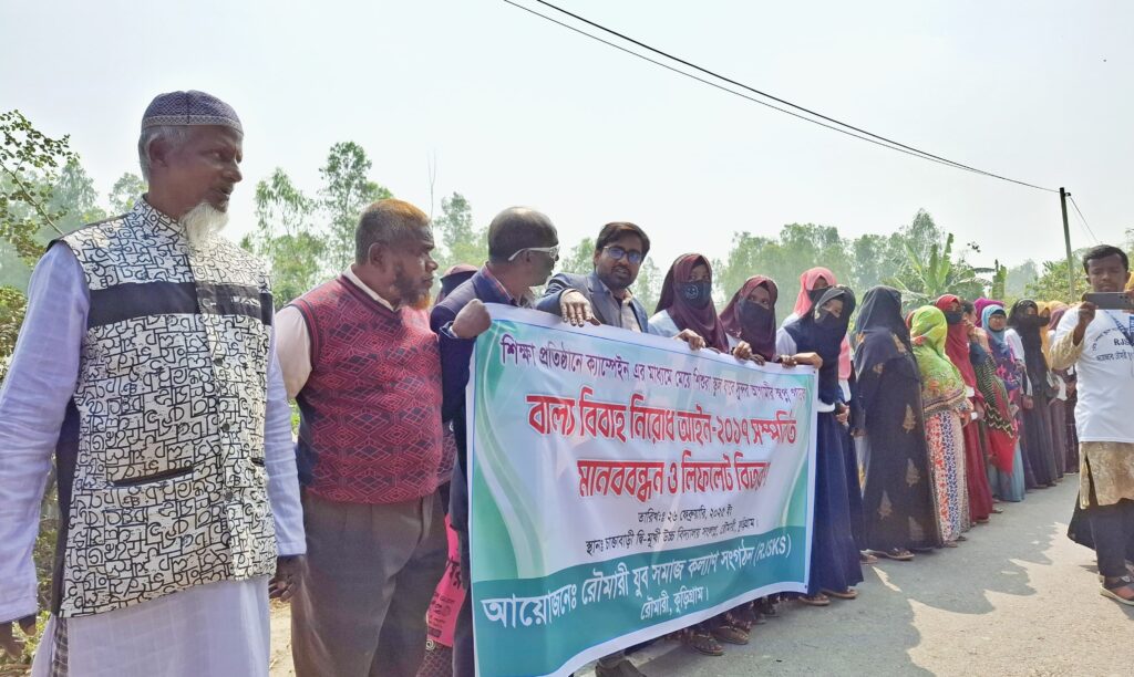কুড়িগ্রামের রৌমারী উপজেলার চাক্তাবাড়ি উচ্চ বিদ্যালয়ের শিক্ষক, শিক্ষার্থী, স্থানীয় গণ্যমান্য ব্যাক্তিবর্গসহ বাল্যবিবাহ প্রতিরোধে মানববন্ধন ও লিফলেট বিতরণ করা হয়। বুধবার ২৬ ফেব্রুয়ারি বেলা ১১ টার দিকে চাইল্ড নট ব্রাইট (সিএনবি) প্রকল্পের আওতায় রৌমারী যুবসমাজ কল্যাণ সংগঠনের আয়োজনে বাল্যবিবাহের হার কমিয়ে আনার লক্ষে মানববন্ধন ও সচেতনতা বৃদ্ধির লক্ষে লিফলেট বিতরণ করা হয়।