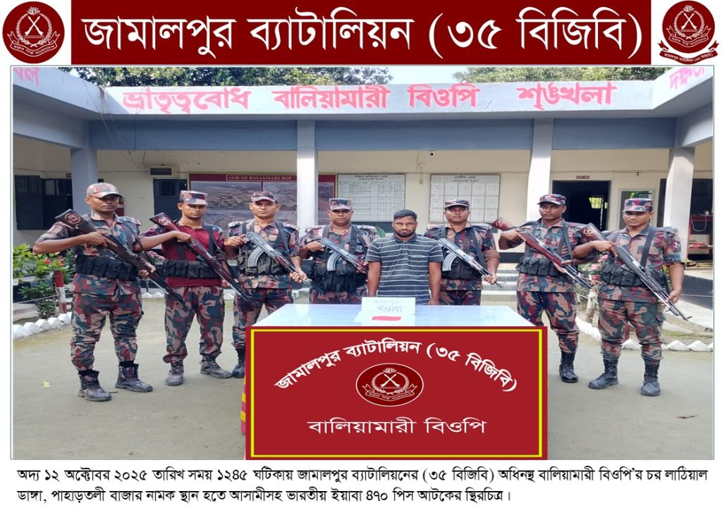 বিজিবি সূত্রে জানা গেছে, জামালপুর ব্যাটালিয়নের (৩৫ বিজিবি) অধিনস্থ উপজেলার বালিয়ামারী বিওপির সীমান্ত পিলার ১০৭২/৫-এস হতে আনুমানিক ৭০০ গজ বাংলাদেশের অভ্যন্তরে চর লাঠিয়াল ডাঙ্গা গ্রামের পাহাড়তলী বাজার (পাগলা বাজার) নামক স্থান হতে ভারতীয় ইয়াবা-৪৭০ পিসসহ বাহারাম বাদশা (৩৫) কে আটক করতে সক্ষম হয়। আটক ব্যাক্তি রৌমারী উপজেলার উত্তর আলগারচর গ্রামের পিতা: ইছাব উদ্দিন ছেলে। আসামীসহ মাদকদ্রব্য চর রাজীবপুর থানায় জমা করার কার্যক্রম প্রক্রিয়াধীন।