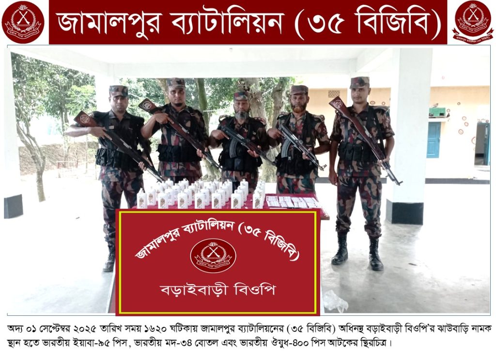 জামালপুর (৩৫ বিজিবি‘র) ব্যাটালিয়ন অধিনায়ক লেঃ কর্ণেল হাসানুর রহমান জানান, রৌমারী উপজেলার সদর ইউনিয়নের ঝাউবাড়ি নামক স্থান থেকে ভারত হতে বাংলাদেশে পাচারের সময় বিশেষ বিজিবির টহলদল গোপন সংবাদের ভিত্তিতে সীমান্ত পিলার ১০৬৮/১ টি হতে ১৫০ গজ বাংলাদেশের অভ্যন্তরে ঝাউবাড়ি এলাকা নামক স্থান হতে মালিকবিহীন অবস্থায় ভারতীয় ইয়াবা ৯৫ পিস, ভারতীয় মদ ৩৪ পিস এবং ভারতীয় ঔষধ ৪০০ পিসসহ বিকালের দিকে আটক করতে সক্ষম হয় বড়াইবাড়ি বিওপি। জব্দকৃত ইয়াবা, ভারতীয় মদ ও ঔষধ রৌমারী থানায় জিডি করত: ধ্বংস করার জন্য ব্যাটালিয়ন সদরে জমা করার প্রক্রিয়া চলমান।