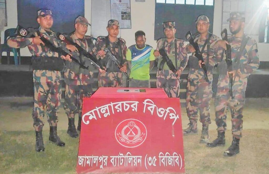 জামালপুর ৩৫ বিজিবি ব্যাটালিয়নের সহকারী পরিচালক (ভারপ্রাপ্ত অ্যাডজুটেন্ট) মোহাম্মদ শামছুল হক জানান, জামালপুর ৩৫ ব্যাটালিয়নের অধিনায়ক লে. কর্নেল হাসানুর রহমান পিএসসির সার্বিক দিক নির্দেশনায় সীমান্তে আন্তর্জাতিক সীমানা মেইন পিলার ১০৬২-৬ এস হতে ২ শত গজ বাংলাদেশের অভ্যন্তরে খাটিয়ামারী নামক এলাকায় ভুট্টা ক্ষেত থেকে এসআইপি’র সিভিল সোর্স এর তথ্যের ভিত্তিতে নাহিদ আহমেদ নামের এক মাদককারবারিকে আটক করে মোল্লারচর বিওপির টহলরত বিজিবি সদস্যরা।