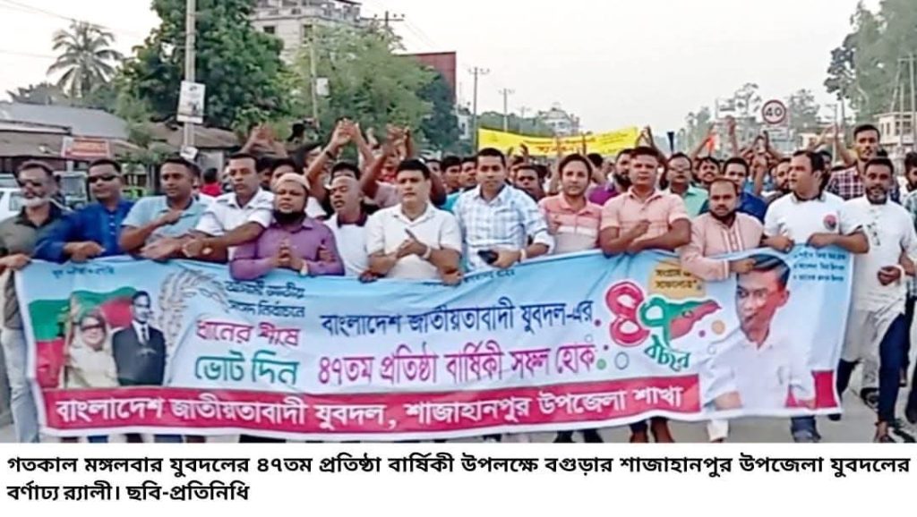 বাংলাদেশ জাতীয়তাবাদী যুবদলের ৪৭তম প্রতিষ্ঠাবার্ষিকী উপলক্ষে শাজাহানপুর উপজেলা যুবদলের উদ্যোগে বর্ণাঢ্য র্যালি ও আলোচনা সভা অনুষ্ঠিত হয়েছে। গতকাল মঙ্গলবার বিকেলে মাঝিড়া বন্দরে এই কর্মসূচি পালন করা হয়।