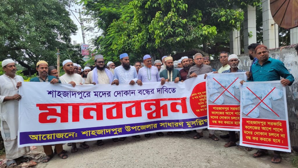 আজ ১২ই জুলাই, শুক্রবার জুম্মার নামাজের পরে। শাহজাদপুর সরকারি কলেজ থেকে শাহজাদপুর মদের দোকান বন্ধের দাবিতে,, মানববন্ধন শুরু হয়ে শাহজাদপুর এর বিভিন্ন সড়ক প্রদক্ষিণ করে এবং শাহজাদপুরের মদের দোকান চলবে না। শাহ মখদুম শাহ দৌলা এর পূর্ণভুমিতে মদের দোকান চলবে না। মদের দোকান বন্ধ করতে হবে। ইত্যাদি স্লোগানে পুরো শাহজাদপুর শহর মুখরিত হয়ে ওঠে। এবং মানববন্ধনের শেষের সময় শাহজাদপুরের বিভিন্ন মানুষেরা মদের দোকান বন্ধের দাবিতে বিভিন্ন কথা তুলে ধরেন।