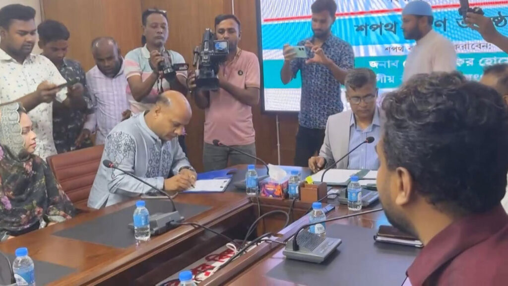 নিজস্ব প্রতিবেদকঃ উপজেলা পরিষদ নির্বাচনে চেয়ারম্যান পদে জয়লাভ করেও আওয়ামী লীগের পরাজিত প্রার্থীর অভিযোগের কারণে শপথ নিতে পারেননি বিএনপির বহিষ্কৃত নেতা মোকাররম হোসেন সুজন। আদালতের নিষেধাজ্ঞা শেষে ৬৬ দিন পর সোমবার (১৯ আগস্ট) সকালে শপথ নেন তিনি।