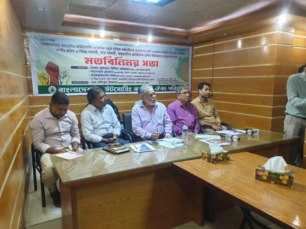 দাবি আদায়ের লক্ষ্যে ২০ দিন শ্রম ভবনের সামনে অবস্থান কর্মসূচি পালন করার পর বৃহস্পতিবার এ মতবিনিময় সভার আয়োজন করে বাংলাদেশ আউটসোর্সিং কর্মচারী ঐক্য পরিষদ। অন্তবর্তী সরকার প্রতিষ্ঠার পর থেকেই তারা বিভিন্ন কর্মসূচিতে নিজেদের ভাগ্য সুসংহত করতে আন্দোলন করে আসছেন। মতবিনিময় সভায় উপস্থিত ক্ষুব্ধ কর্মীরা ‘বেতন দেবে সরকার, দালালের কী দরকার’, ‘বেতন দেবে সরকার, ঠিকাদারের কী দরকার’, ‘দুনিয়ার মজদুর, এক হও’ ইত্যাদি স্লোগান দেন।