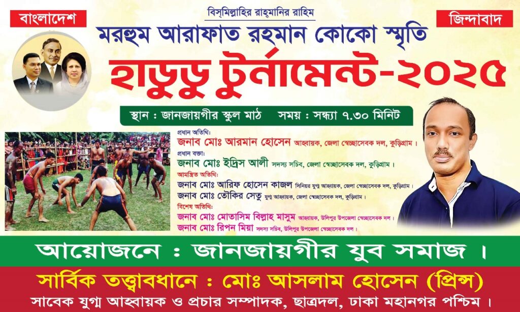 ২৮ জুন রাত ৯ ঘটিকায় জানজায়গীর স্কুল মাঠে সাবেক যুগ্ম আহবায়ক ও প্রচার সম্পাদক, ছাত্রদল ঢাকা মহানগর মোঃ আসলাম হোসেন প্রিন্স, এর সার্বিক তত্ত্বাবধানে মরহুম আরাফাত রহমান কোকো স্মৃতি হাডুডু ২০২৫ এর প্রথম রাউন্ড এর দ্বিতীয় খেলা অনুষ্ঠিত হয়েছে।