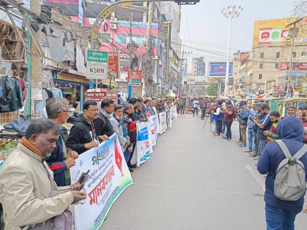 সোমবার(১৩ জানুয়ারি) রাজশাহী নগরীর জিরো পয়েন্ট এলাকায় জাতীয় সাংবাদিক সংস্থা রাজশাহী বিভাগ ও রাজশাহী মডেল প্রেসক্লাবের আয়োজনে রাজশাহীর স্থানীয় সাংবাদিক সংগঠনসহ রাজশাহীর বিভিন্ন জেলা ও উপ-জেলার সাংবাদিক সংগঠনের ব্যানারে এই মানববন্ধন করা হয়।