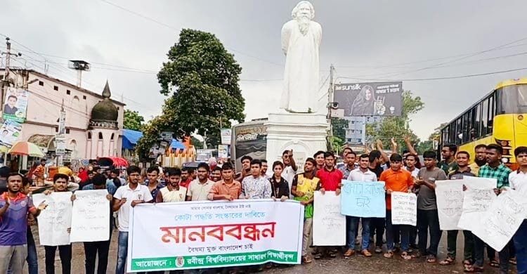 সরকারি চাকরিতে কোটা বাতিলের দাবিতে বিক্ষোভ মিছিল ও মানববন্ধন করেছেন রবীন্দ্র বিশ্ববিদ্যালয়ের সাধারণ শিক্ষার্থীরা।